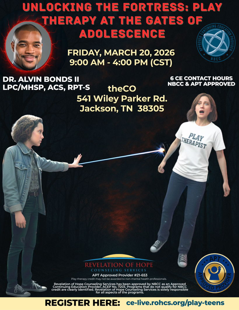 Revelation for Hope Counseling Services has been approved by APT as an Approved Provider of Play Therapy Continuing Education, APT #21-653. Play therapy credit may not be awarded to non-mental health professionals.